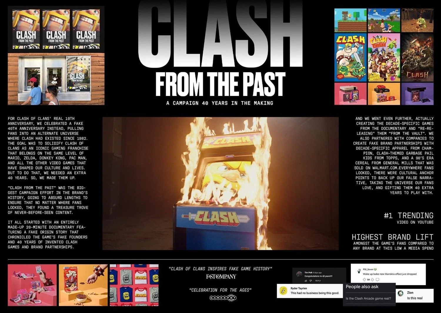 Clash from the Past Case Study 2 Aug Written By Dani Comar A real fake that created a brand origin story from scratch. Cannes Lions 2023 Entertainment Grand Prix. View fullsize entertainmentstuntguerrillasocial mediastorytellingintegratedwieden-kennedyusanorth americaclash of clansgaminggameemotionfunaward-winningcraftcannes lions 2023 Dani Comar Creative Consultant and Workshop Facilitator http://activationideas.com