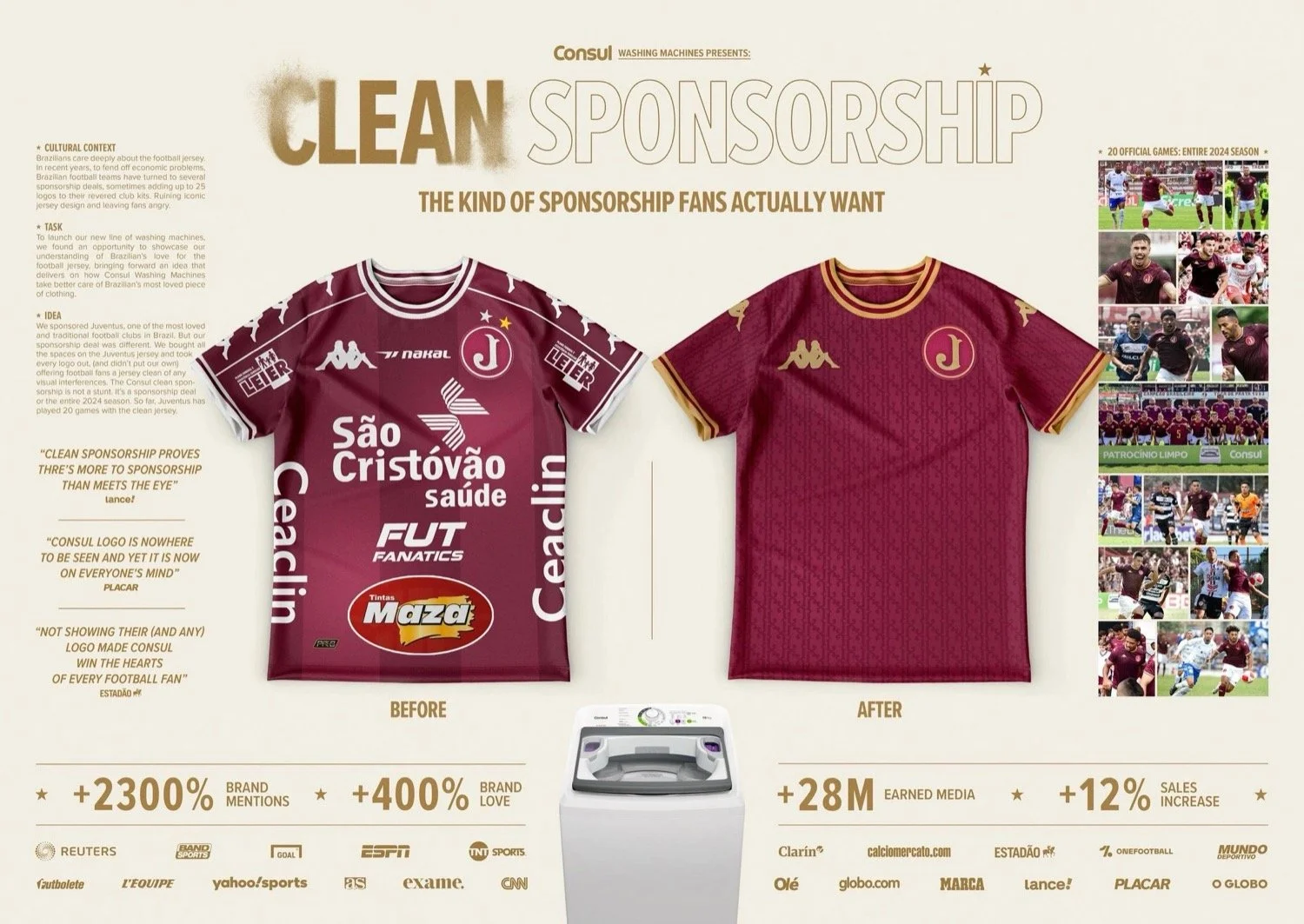 Clean Sponsorship Case Study 26 Sept Written By Dani Comar What better for a washing machine brand sponsoring a football club than washing away all the logos? View fullsize sponsorshipcreative solutiondesignstuntpublic relationsdm9brazillatinaconsulhouseholdlaundrywhite goodsaward-winningcannes lions 2024 Dani Comar Creative Consultant and Workshop Facilitator http://activationideas.com