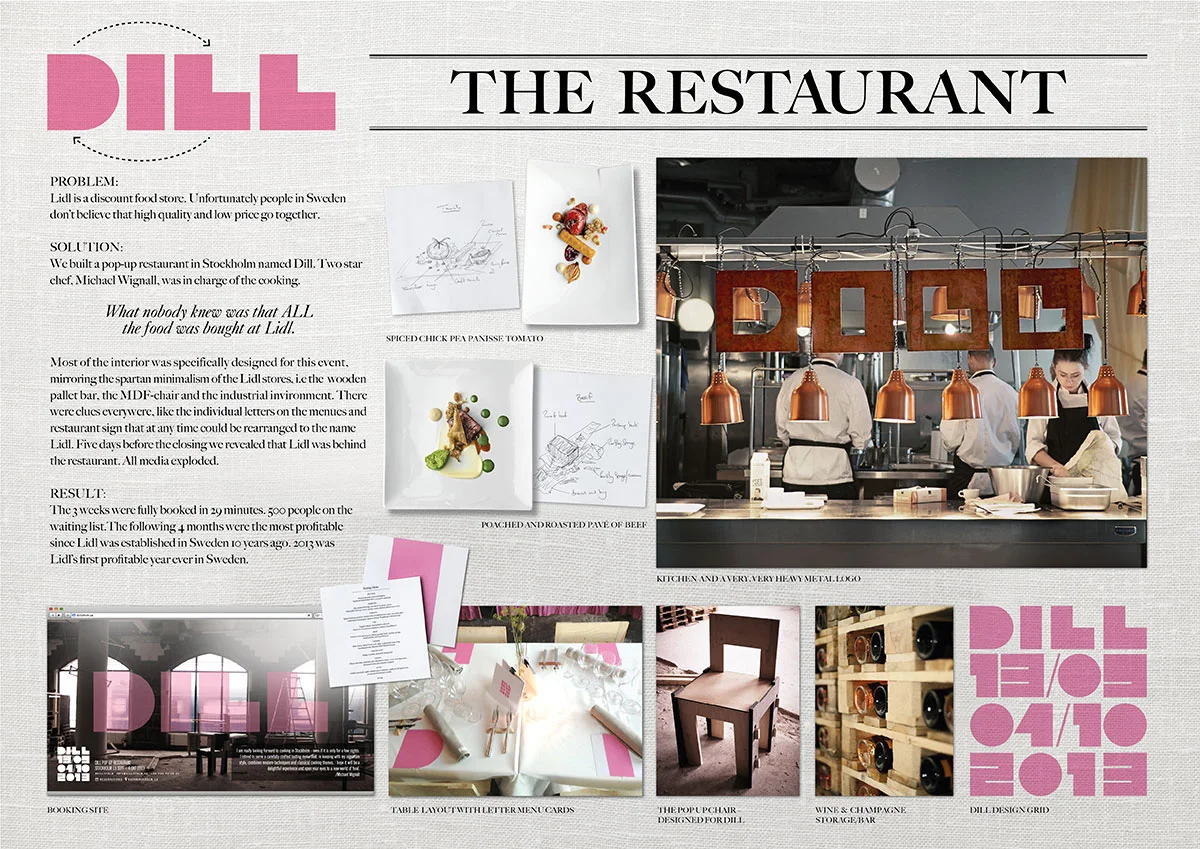Debunking perceptions by proving the opposite. Food retailer LIDL in Sweden was perceived as cheap, yet not of great quality. So the setup a gourmet pop-up restaurant that became a sensation, to reveal later that all the exquisite dishes were prepared with food from the supermarket.
