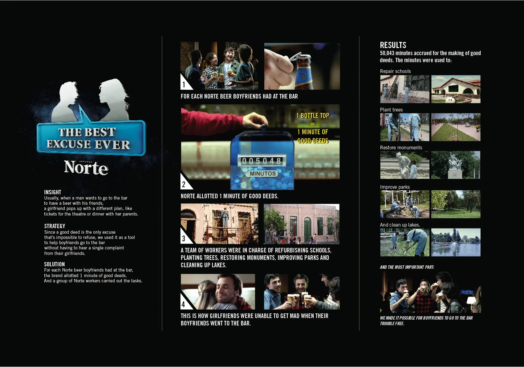 Cerveza Norte, from Argentina, took an approach full of contrasts with ‘The Best Excuse Ever’ campaign. Not that men need any excuse to go out and drink beer, but their girlfriends probably do.