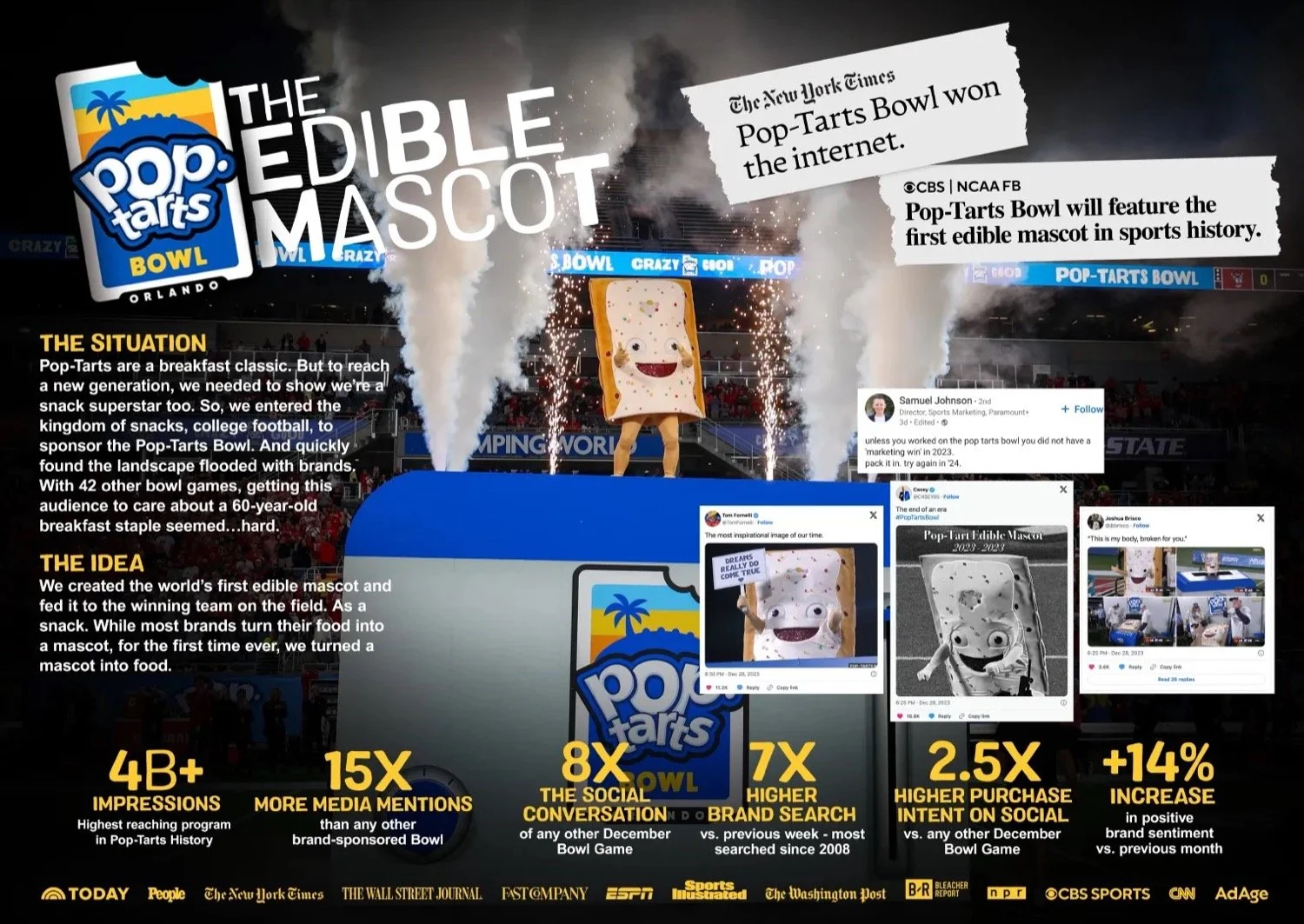 The First Edible Mascot Case Study 21 Jun Written By Dani Comar A sponsorship to die for. The mascot, that is. 2024 Cannes Lions Brand Experience & Activation Grand Prix. stuntsponsorshipeventsportssocial mediaweberusanorth americapop-tartssnacksfoodfmcgaward-winningcannes lions 2024 Dani Comar Creative Consultant and Workshop Facilitator http://activationideas.com