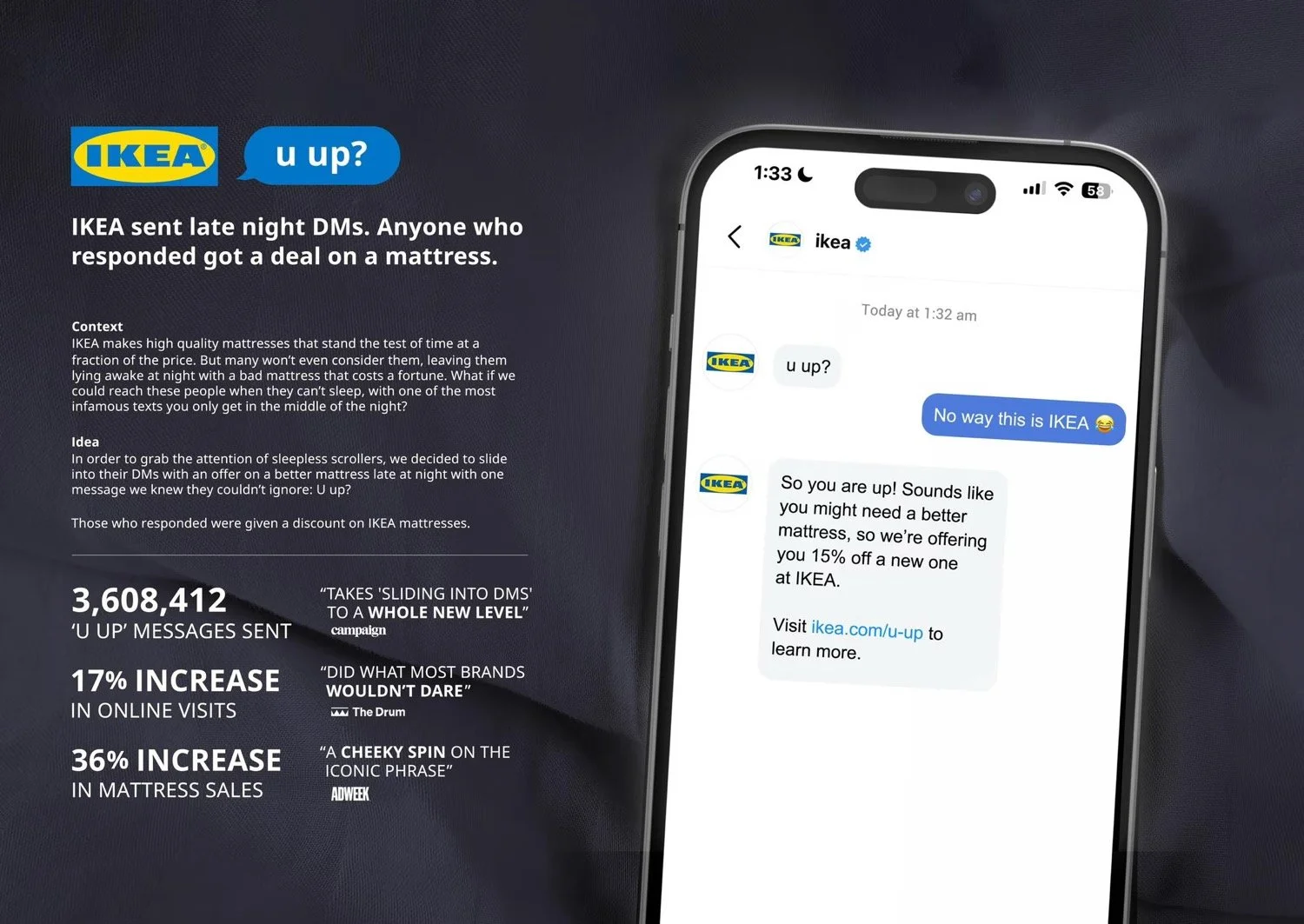 On your phone at 2am? Perfect moment to offer a new mattress. While a late-night promotional message would normally feel out of place, the two-word text that usually means something else entirely won people over on Valentine’s Day.